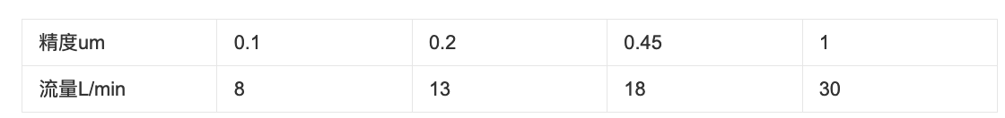 纯水流量参考值:10"滤芯初始值L/min(△P=0.01 MPa, 1厘泊粘度,25℃)